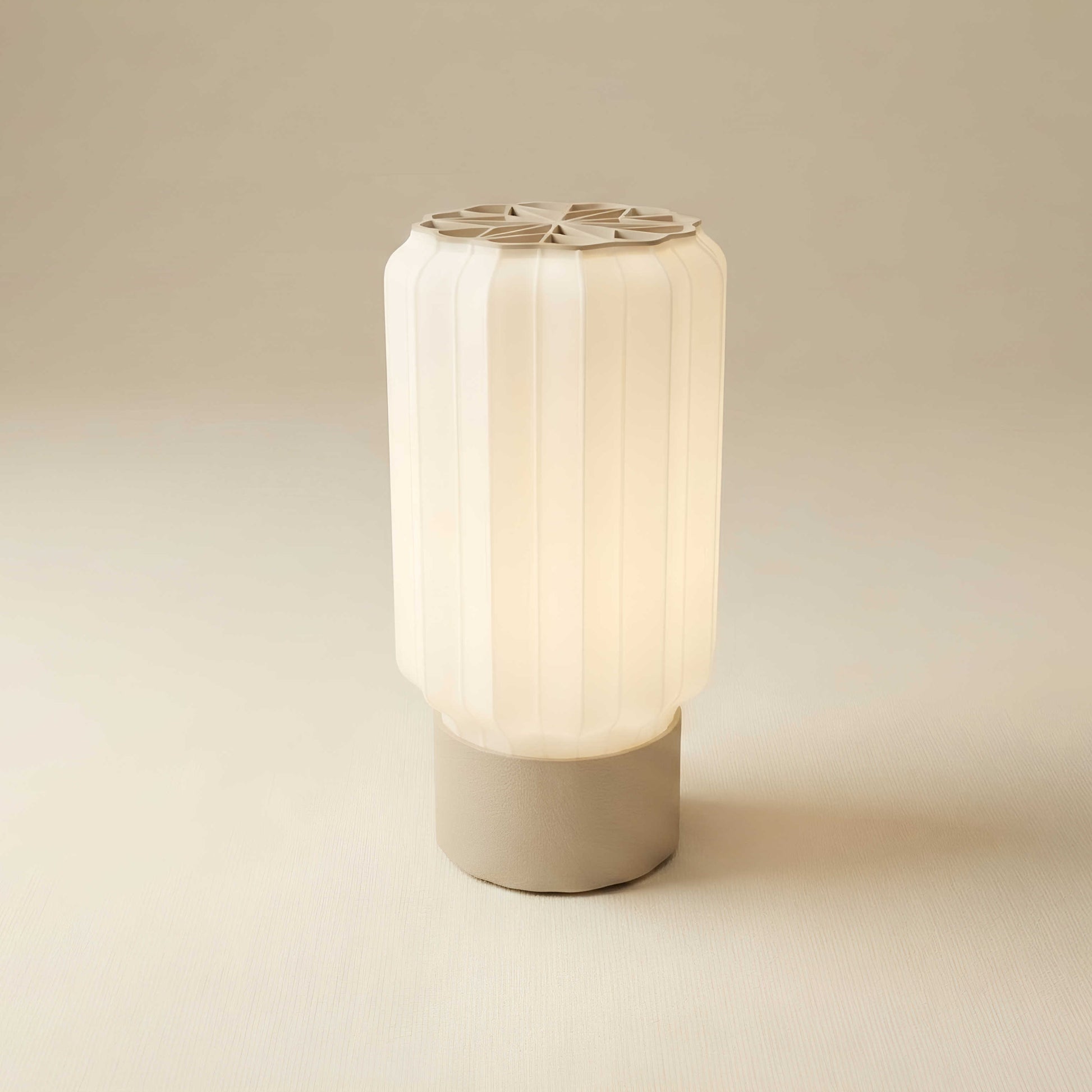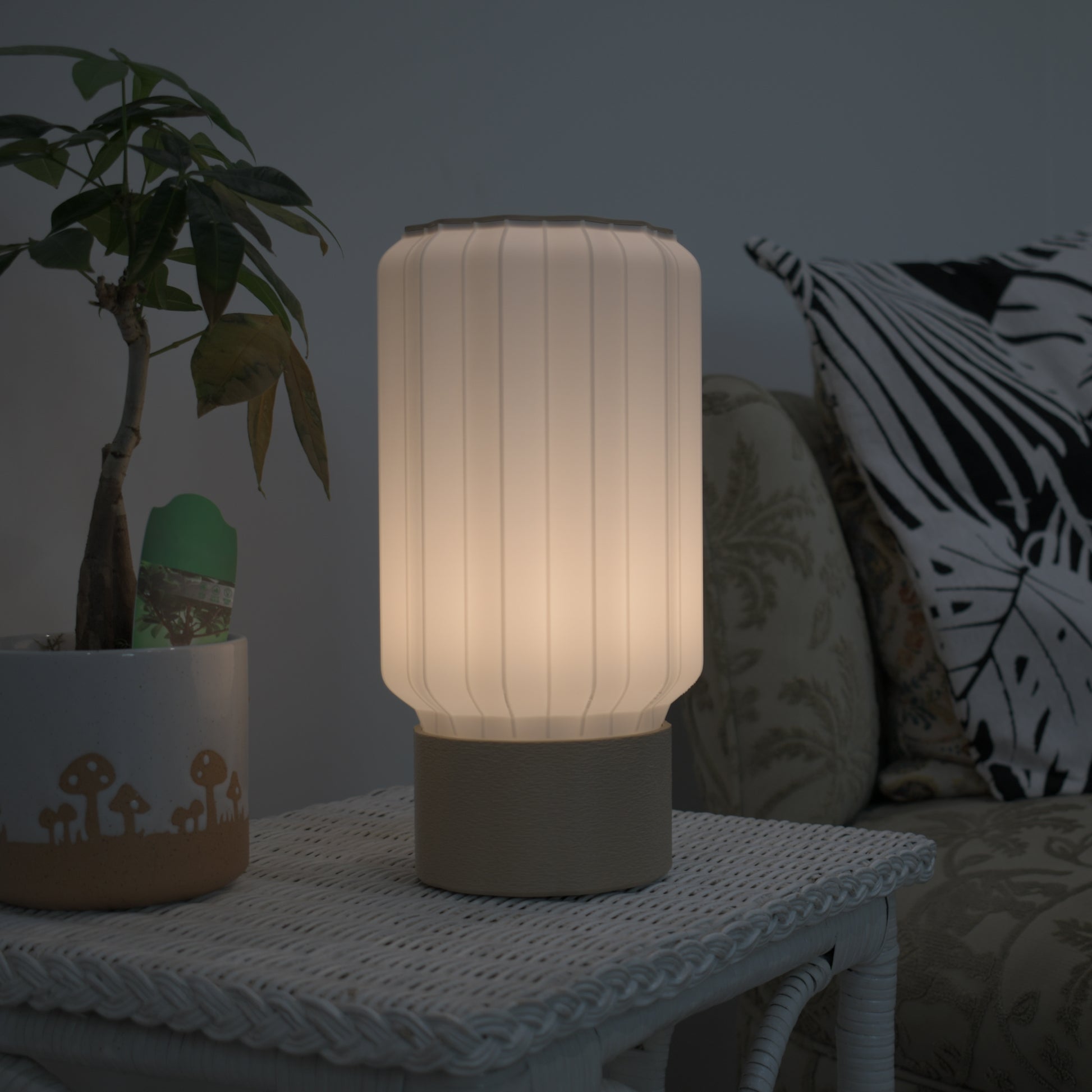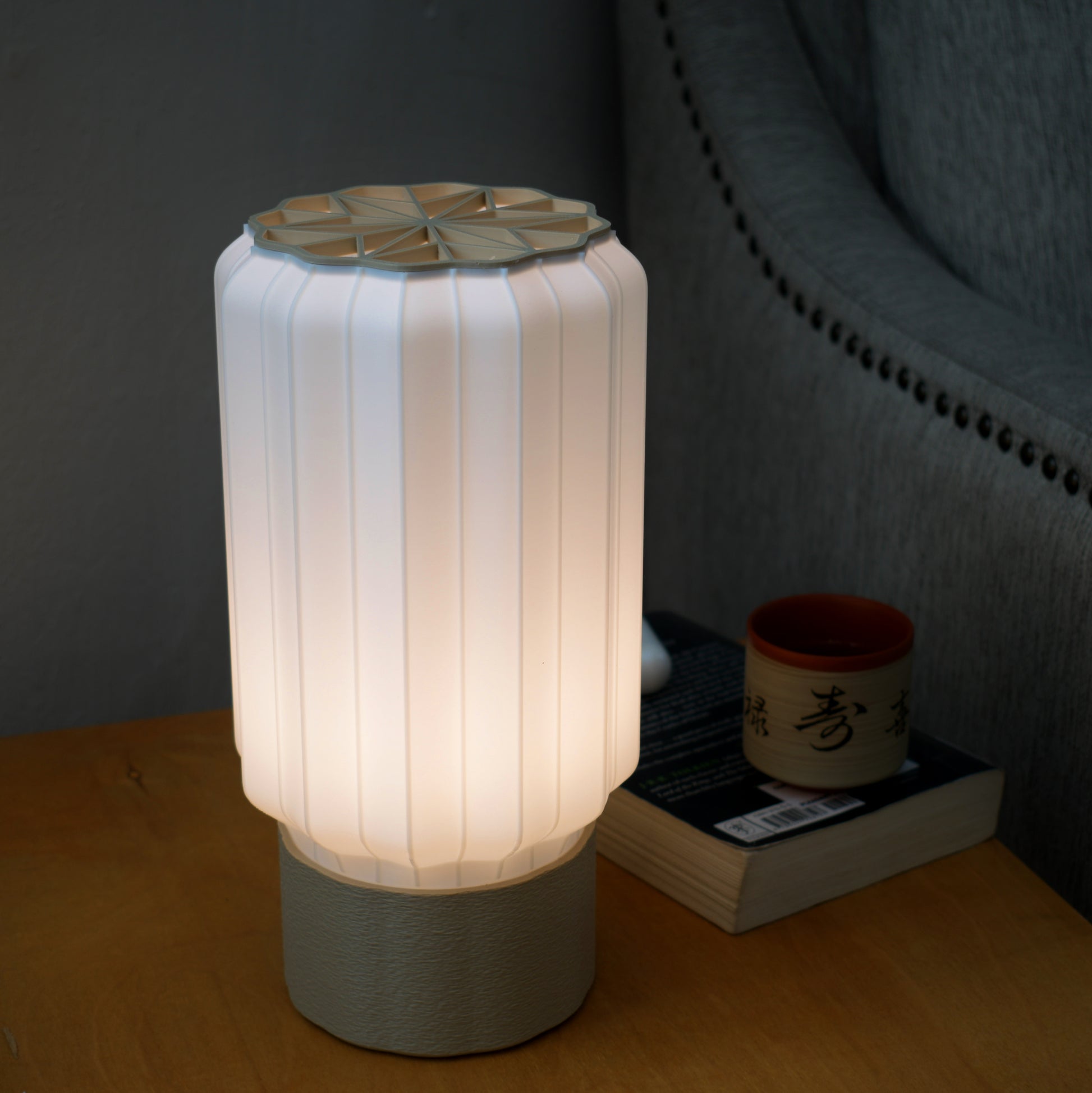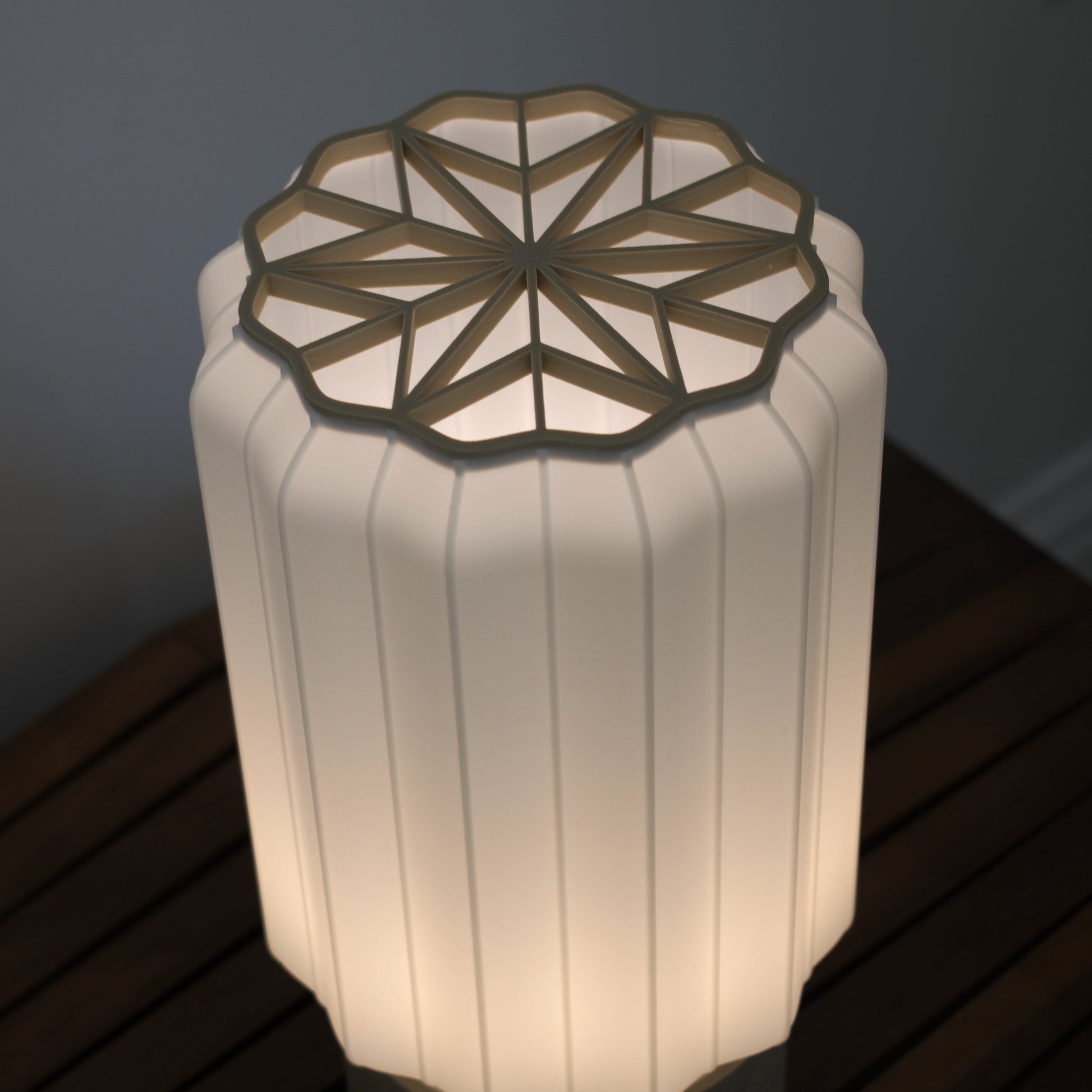 The Iku lamp follows the simple and functional aesthetic of Japandi which focuses on clean lines, neutral colors, and minimalism to create a calm, cozy, and organized spaces. Taking a cue from the "less is more" ideology, the profile of this 3D printed lamp is a simple cylinder reminiscent of Japanese paper lanterns, mimicking the traditional washi paper stretched over a framework of thin bamboo ribs. The top of the lamp features a sakura pattern found in traditional Kumiko wood working that creates a striking silhouette against the light emanating from below.